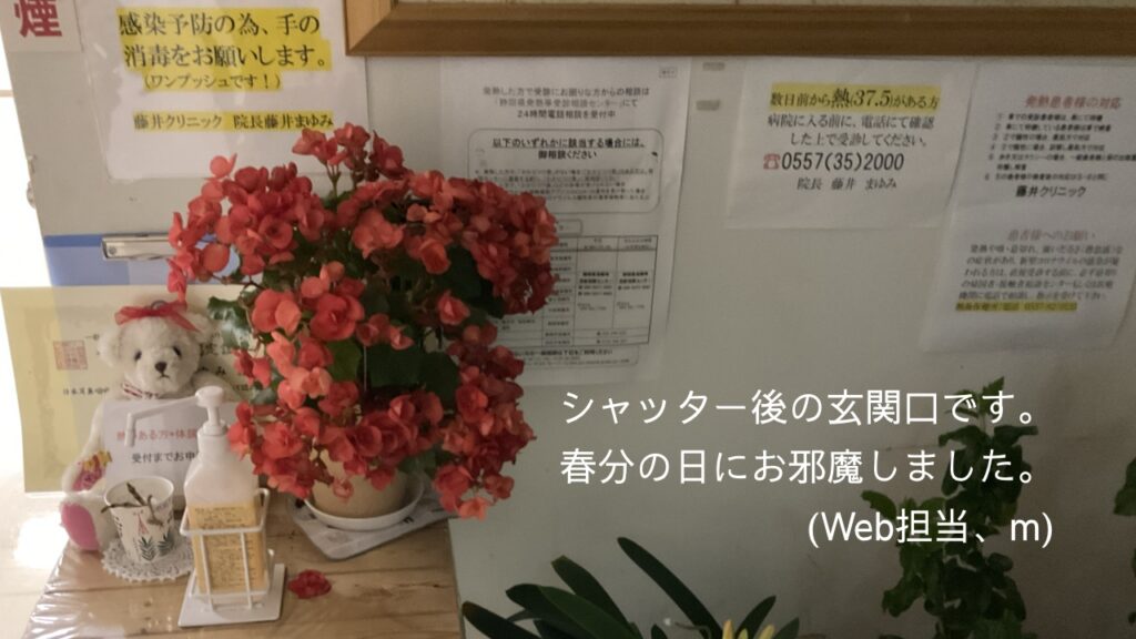 インフルエンザ予防接種:予約で行います。保険外負担です。伊東市65歳以上1500円、一般1回目4000円、2回目3500円です。