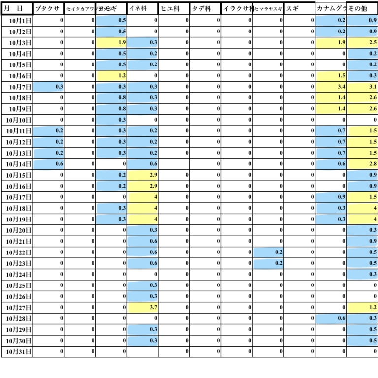 *クリニック休診日は花粉カウントもお休み。翌朝、2日分の花粉数を割り算(9/4木曜休診で翌朝カウントすると、9/3分+9/4分=0.2個→それぞれ0.1個)。
