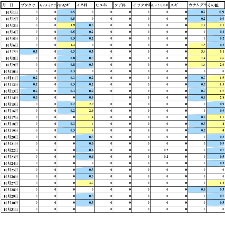 草花粉カウントには少し高い観測地点(3階建ビル屋上)なので、低地の草花粉数はもう少し多いでしょう。
