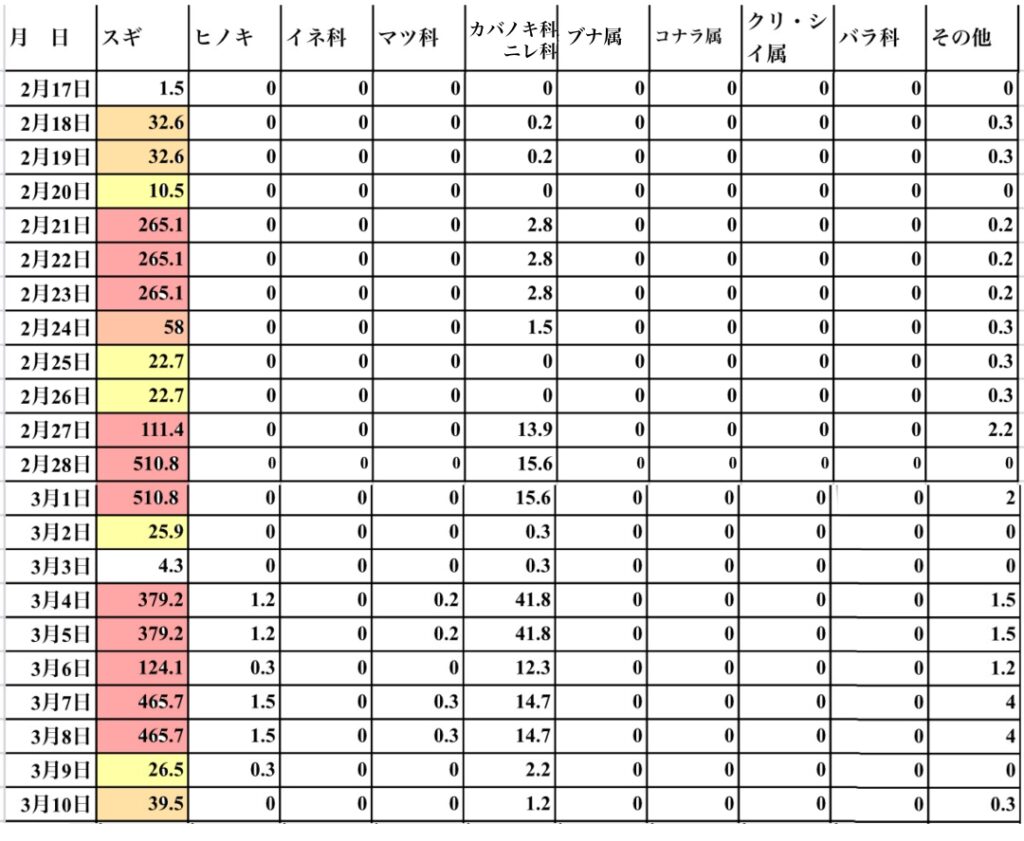 ※表は見やすく編集しました。元データも後日「花粉スタディ@伊東」のページに掲載されます。(Web担当、m)