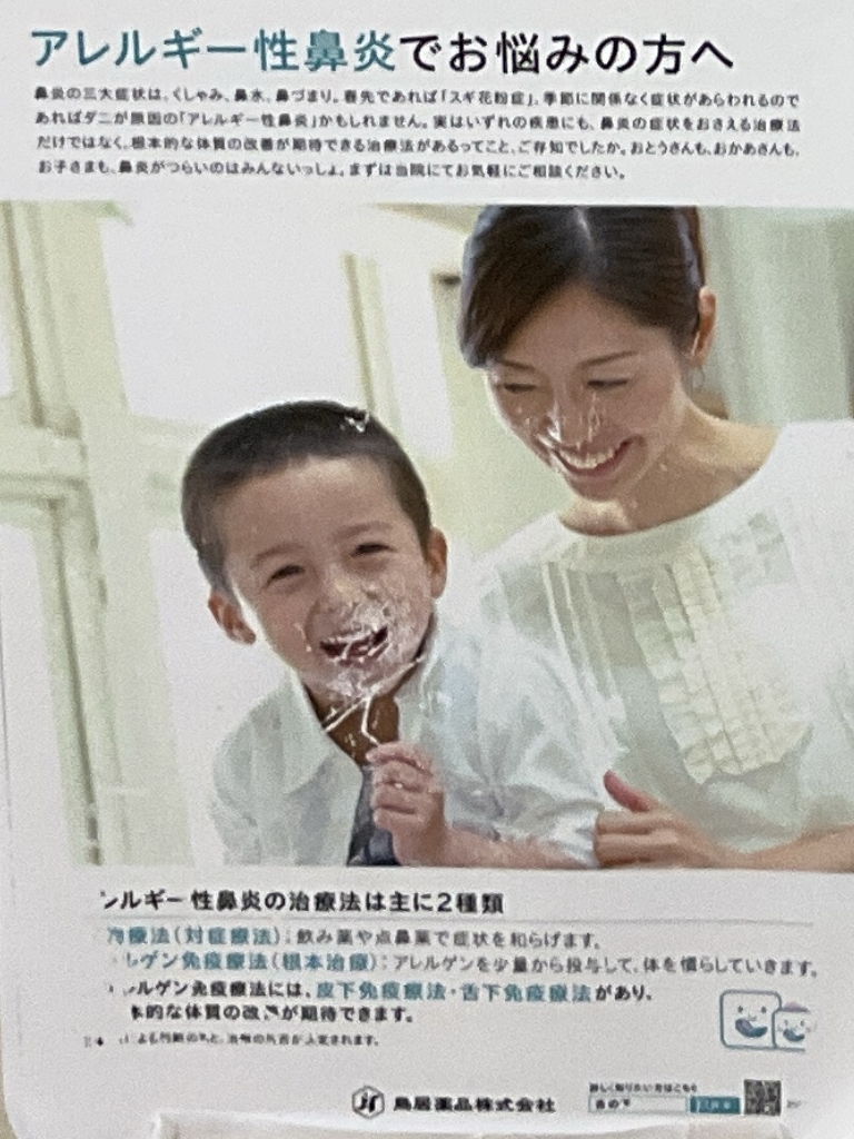 私「このポスターはげちゃってますね。アレルギー鼻炎の対症療法は飲み薬や点鼻薬って書いてあるけど、私が子供の頃は、鼻炎は鼻洗浄だけでした。いろいろ変わってるんですか?」