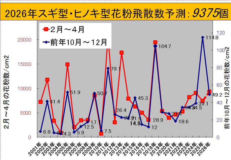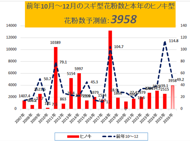予測値は前年秋冬期花粉数と過去の春期花粉数から統計学的に算出されています。