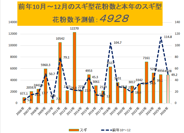 前年秋冬期スギ花粉数と春期スギ花粉数に有意な相関は無く、前年秋冬期スギ花粉数から春期スギ花粉数は予測できない、と言われるようになりました。